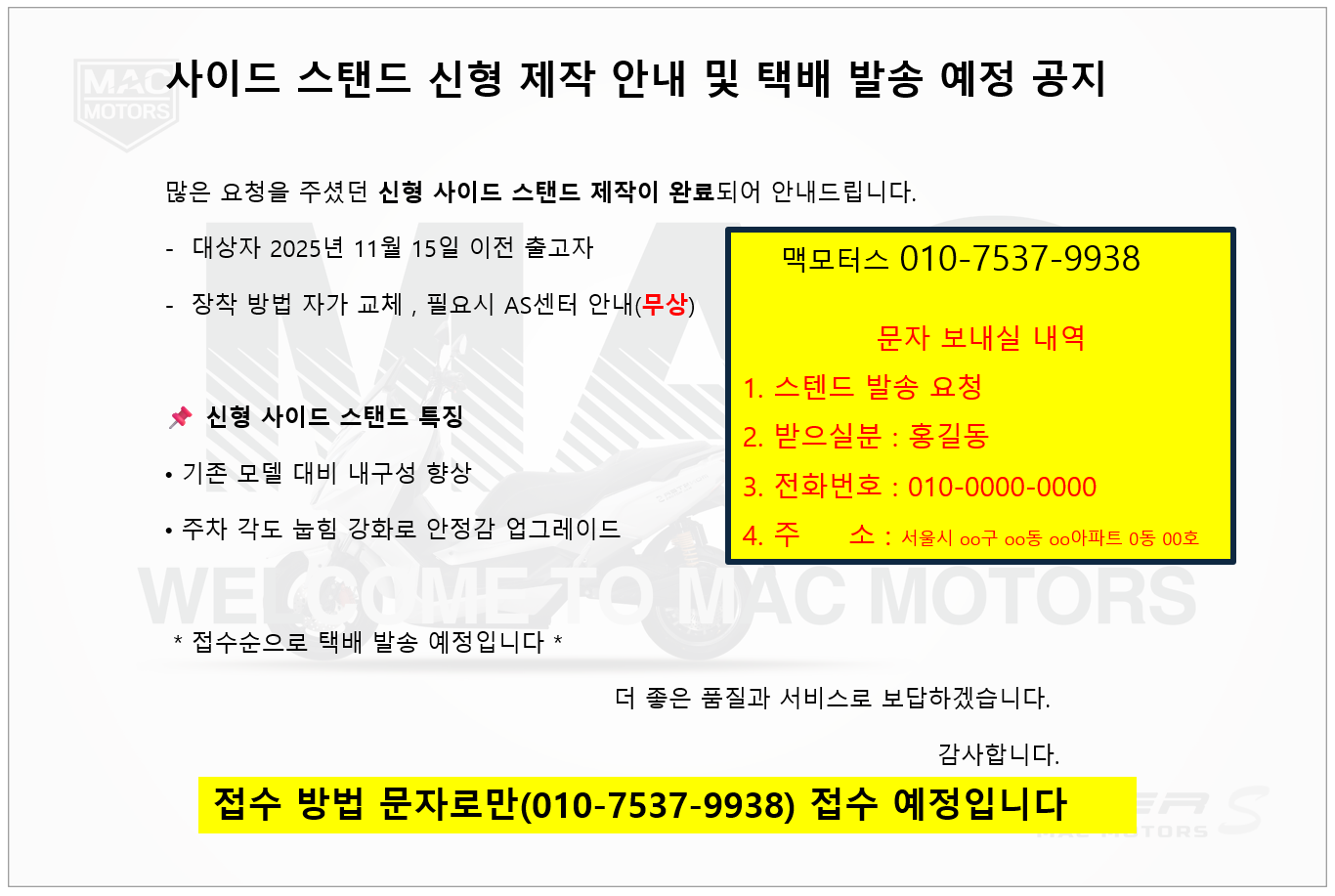 고객님의 편안한 라이딩을 위해 맥모터스가 함께합니다.언제나 최선을 다해 지원하겠습니다.전화,채팅,이메일 등을 통해 문의해 주세요.