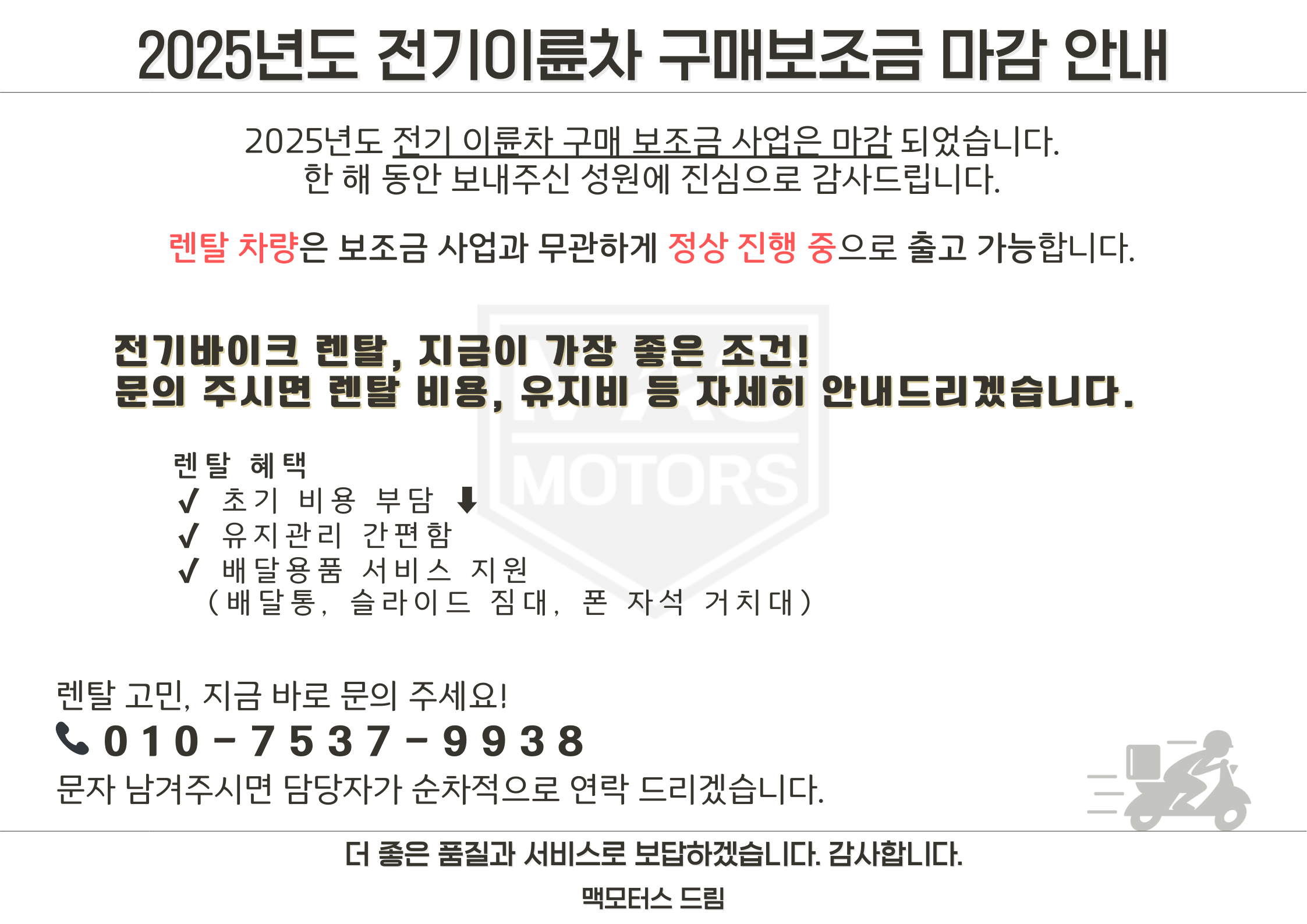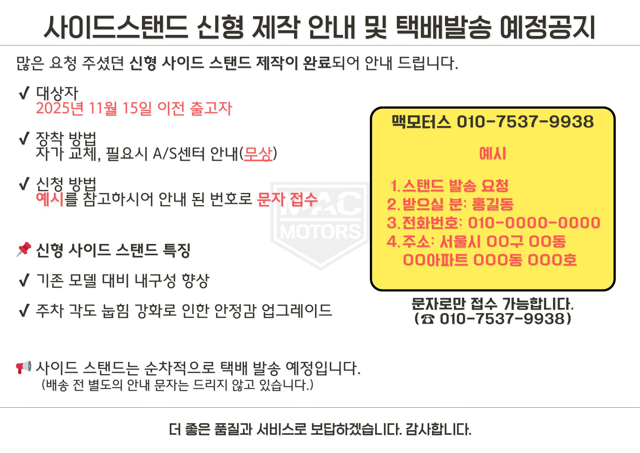 고객님의 편안한 라이딩을 위해 맥모터스가 함께합니다.언제나 최선을 다해 지원하겠습니다.전화,채팅,이메일 등을 통해 문의해 주세요.